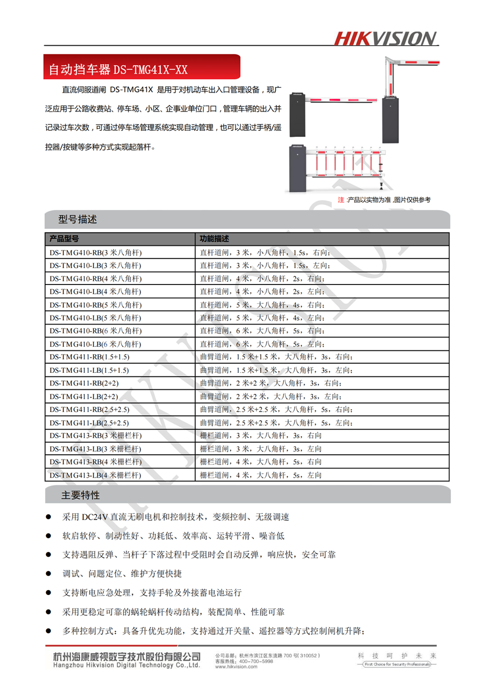 直流伺服道闸 DS-TMG41X 是用于对机动车出入口管理设备,现广泛应用于公路收费站、停车场、小区、企事业单位门口,管理车辆的出入并记录过车次数,可通过停车场管理系统实现...